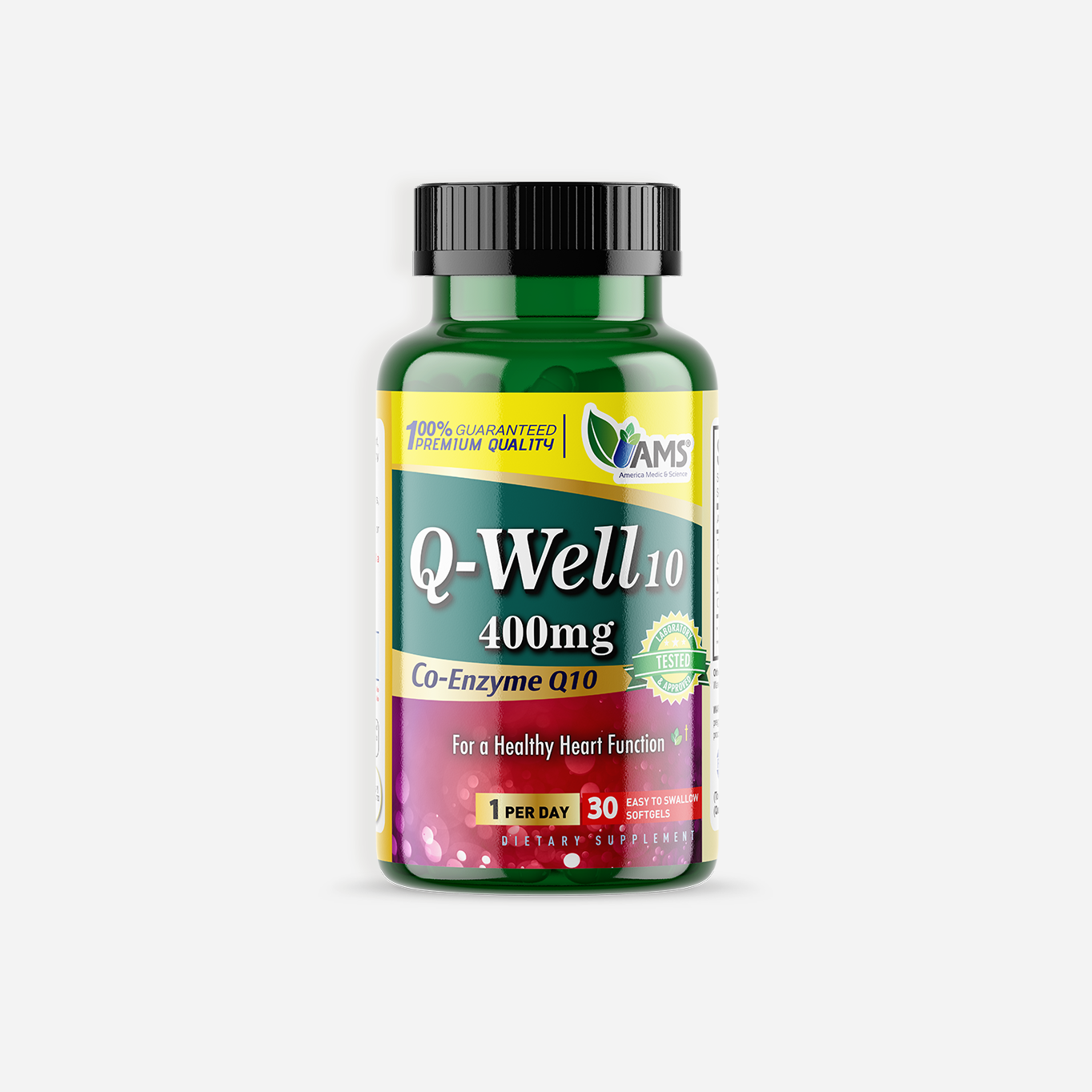 AMS® Q-Well 10 400mg provides 400mg of the potent antioxidant Co-Enzyme Q10. CoQ10 assists in heart health.CoQ10 also is a powerful antioxidant and lessens harmful free radicals which maintains skin health. CoQ10 also boosts immunity and physical performance.