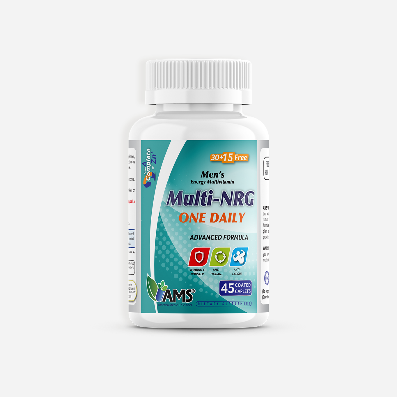 AMS® Men’s Multi-NRG is an Advanced Multivitamin Formula for men, indicated to boost immunity, assist in healthy lifestyle, supplements body nutritional needs and has antioxidant properties. AMS® Men’s Multi-NRG uses a potent formula of vitamins, minerals and many other natural ingredients such as: Ginkgo Biloba, Ginseng and Acetyl L-Carnitine. Men have different nutritional needs than women, so finding the best multivitamin for men can definitely be a challenge. The best Men’s multivitamin should include enough of several important micronutrients that are directly involved in overall health and wellness.